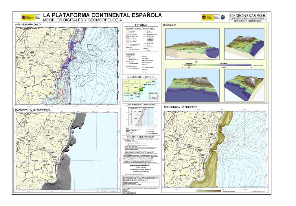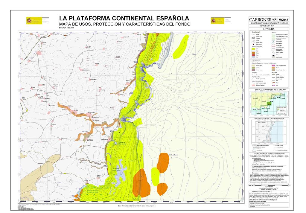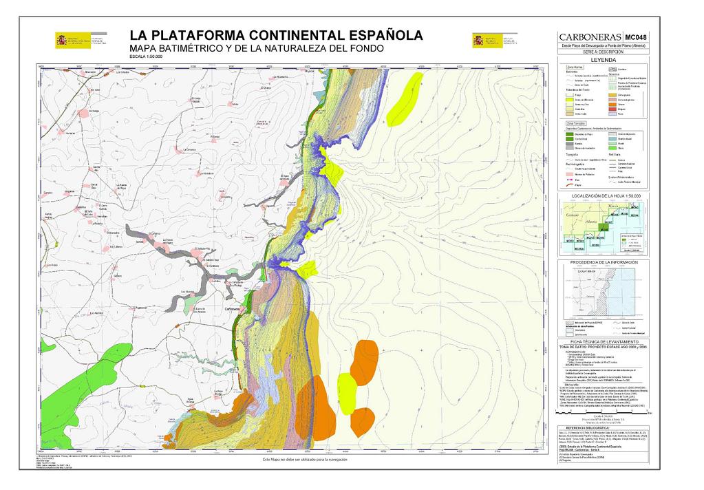 Sanz, J.L., Hermida, N., Tello, O., Lobato, A., Fernández-Salas, L.M.,González, J.L., Bécares, M.A., Gómez de Paz, R., Godoy, D., Alcalá, C., Contreras, D., Ubiedo, J.M., Ramos, M., Torres, A., Carreño, F., Pérez, J.I., Alfageme, V.M., Redondo, B.C , Velasco, D , Pascual, L , Pastor, E. y González, F. 2003. Hoja MC048 CARBONERAS: Desde Playa del Descargador a Punta del Plomo (Almería). Serie C: Modelos y Geomorfología. Serie cartográfica Estudio de la Plataforma continental Española. IEO-SGPM. Madrid.ISBN: 84-95877-12-0. Obra completa ISBN: 84-95877-04-X.