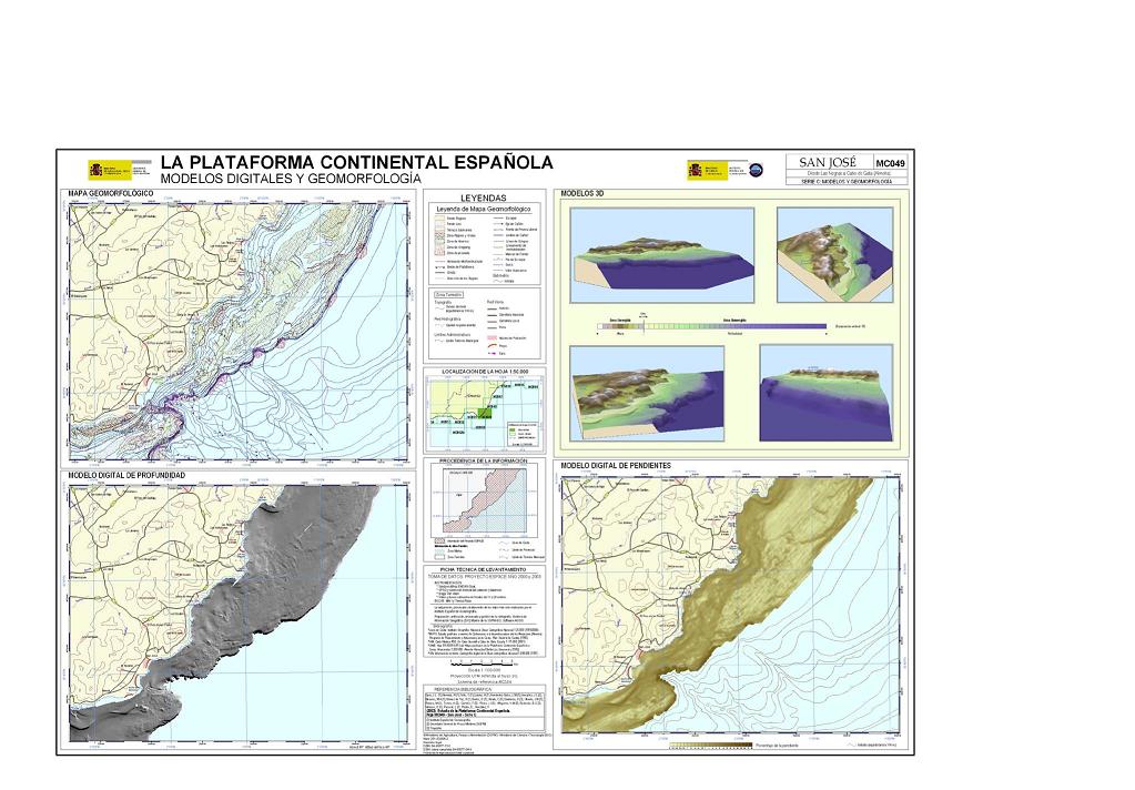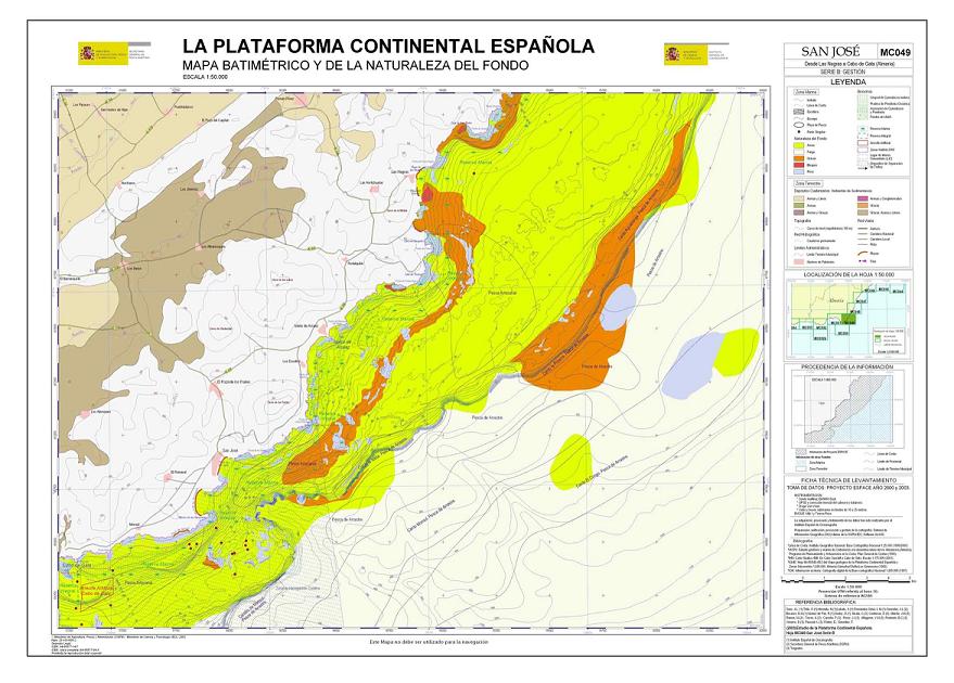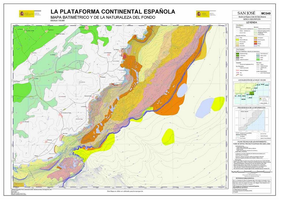 Sanz, J.L., Hermida, N., Tello, O., Lobato, A., Fernández-Salas, L.M.,González, J.L., Bécares, M.A., Gómez de Paz, R., Godoy, D., Alcalá, C., Contreras, D., Ubiedo, J.M., Ramos, M., Torres, A., Carreño, F., Pérez, J.I., Alfageme, V.M., Redondo, B.C., Velasco, D., Pascual, L., Pastor, E. y González, F. 2003. Hoja MC049 SAN JOSÉ: Desde Las Negras a Cabo de Gata (Almería). Serie C: Modelos y Geomorfología. Serie cartográfica Estudio de la Plataforma continental Española. IEO-SGPM. Madrid.ISBN: 84-95877-15-5. Obra completa ISBN: 84-95877-04-X.