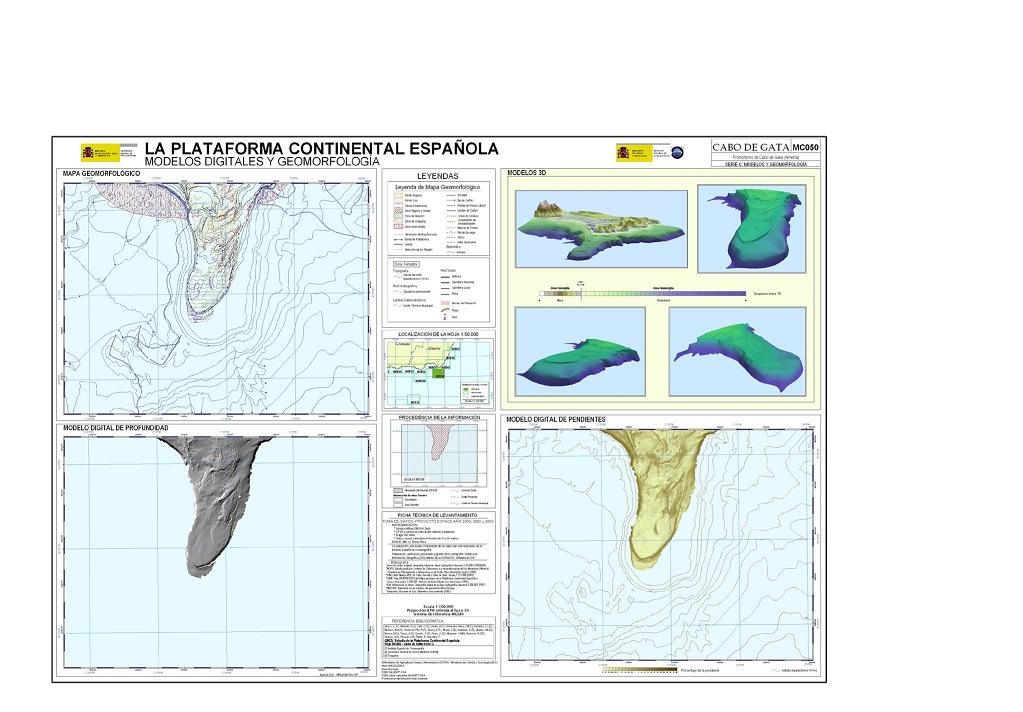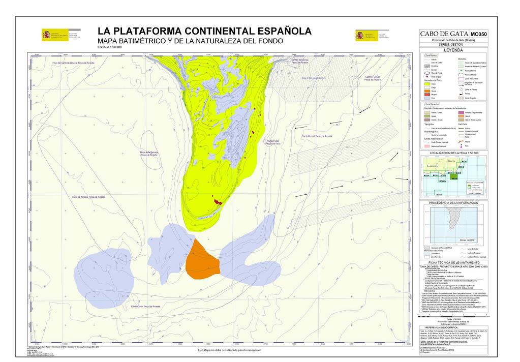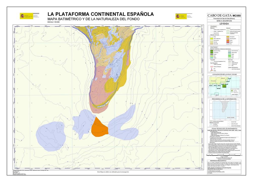 Sanz, J.L., Hermida, N., Tello, O., Lobato, A., Fernández-Salas, L.M., González, J.L., Bécares, M.A., Gómez de Paz, R., Godoy, D., Alcalá, C., Contreras, D., Ubiedo, J.M., Ramos, M., Torres, A., Carreño, F., Pérez, J.I., Alfageme, V.M, Redondo, B.C., Velasco, D., Pascual, L., Pastor, E. y González, F. 2003. Hoja MC050 CABO DE GATA: Promontorio de cabo de Gata (Almería). Serie C: Modelos y Geomorfología. Serie cartográfica Estudio de la Plataforma continental Española. IEO-SGPM. Madrid.ISBN: 84-95877-18-X. Obra completa ISBN: 84-95877-04-X.