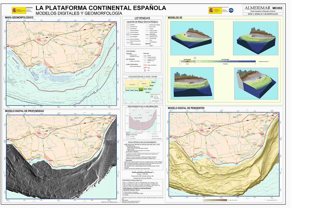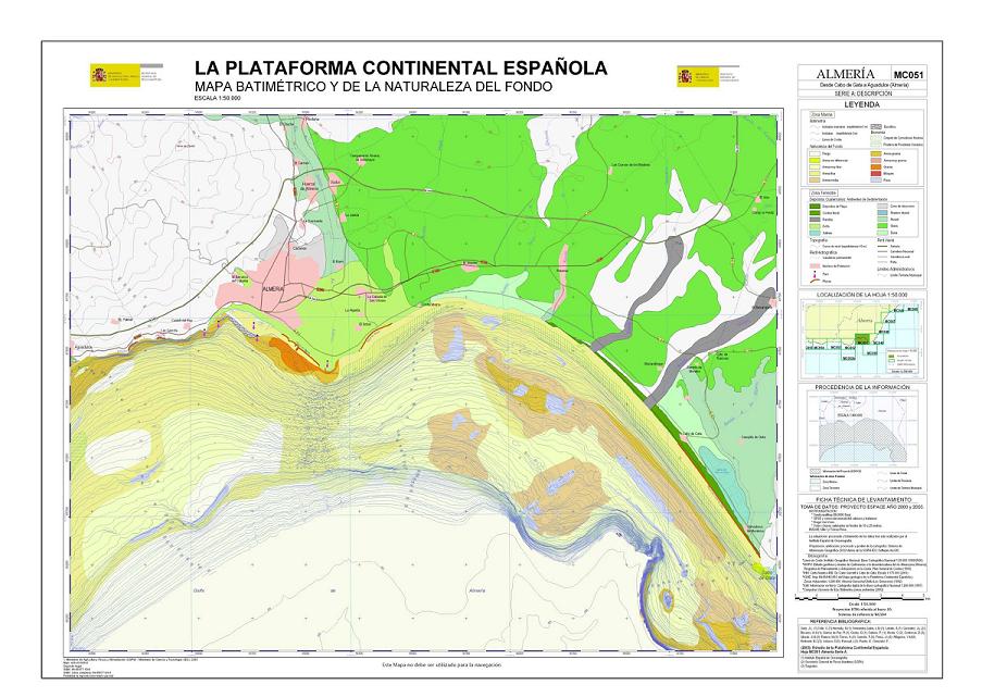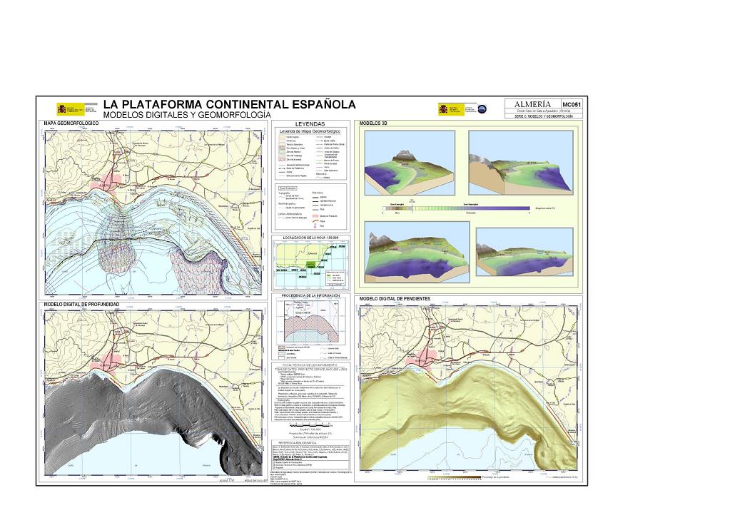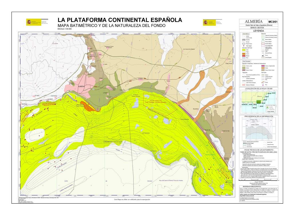 Sanz, J.L., Hermida, N., Tello, O., Lobato, A., Fernández-Salas, L.M., González, J.L., Bécares, M.A., Gómez de Paz, R., Godoy, D., Cubero, P. , Alcalá, C., Contreras, D., Ubiedo, J.M., Ramos, M., Torres, A., Carreño, F., Pérez, J.I., Alfageme, V.M., Redondo, B.C., Velasco, D., Pascual, L., Pastor, E. y González, F. 2003. Hoja MC051 ALMERÍA: Desde cabo de Gata a Aguadulce (Almería). Serie C: Modelos y Geomorfología. Serie cartográfica Estudio de la Plataforma continental Española. IEO-SGPM. Madrid.ISBN: 84-95877-12-0. Obra completa ISBN: 84-95877-21-X.