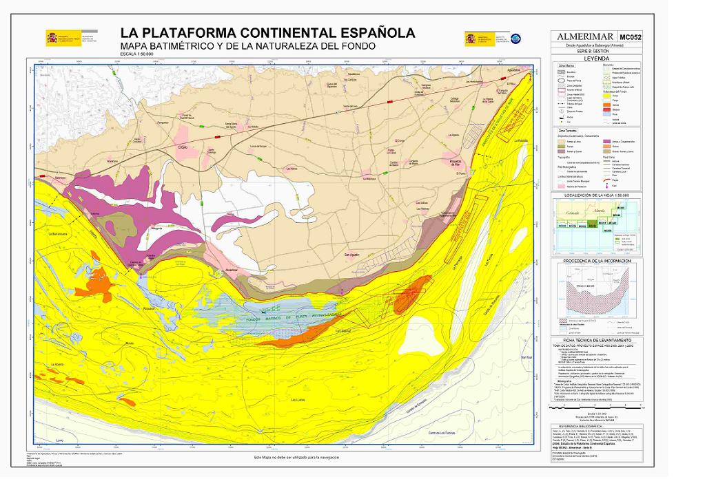 Sanz, J.L. ;Tello, O.;Hermida, N.; Fernández-Salas, L.M.; Gil de Sola, L.; González, J.L.; Pastor, E.; Bécares, M.A.; Cubero, P.; Godoy, D.; Alcalá, C.; Contreras, D.; Frias, A.J.; Ramos, M.; Torres, A.; Ubiedo, J.M.; Alfageme, V.M; Carreño, F.; Pascual, L; Pérez, J.I.;Redondo, B.C; Velasco, D; González, F.. 2004. Serie cartográfica Estudio de la Plataforma continental Española. Hoja MC052 ALMERIMAR: Aguadulce a Balanegra (Almería). Serie B: Gestión. ISBN: 84-95877-24-4. ISBN (Obra completa): 84-95877-04-X.