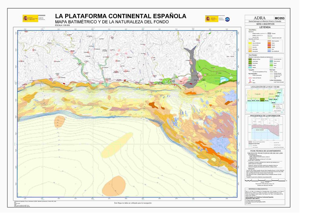 Sanz, J.L. ;Tello, O.;Hermida, N.; Fernández-Salas, L.M.; Gil de Sola, L.; González, J.L.; Pastor, E.; Bécares, M.A.; Cubero, P.; Godoy, D.; Alcalá, C.; Contreras, D.; Frias, A.J.; Torres, A.; Alfageme, V.M; Carreño, F.; Pascual, L; Pérez, J.I.;Redondo, B.C; Velasco, D; González, F.. 2004. Serie cartográfica Estudio de la Plataforma continental Española. Hoja MC053 ADRA: Desde Balanegra La Mamola (Almería y Granada). Serie B: Gestión.ISBN: 84-95877-27-9. ISBN (Obra completa): 84-95877-04-X.